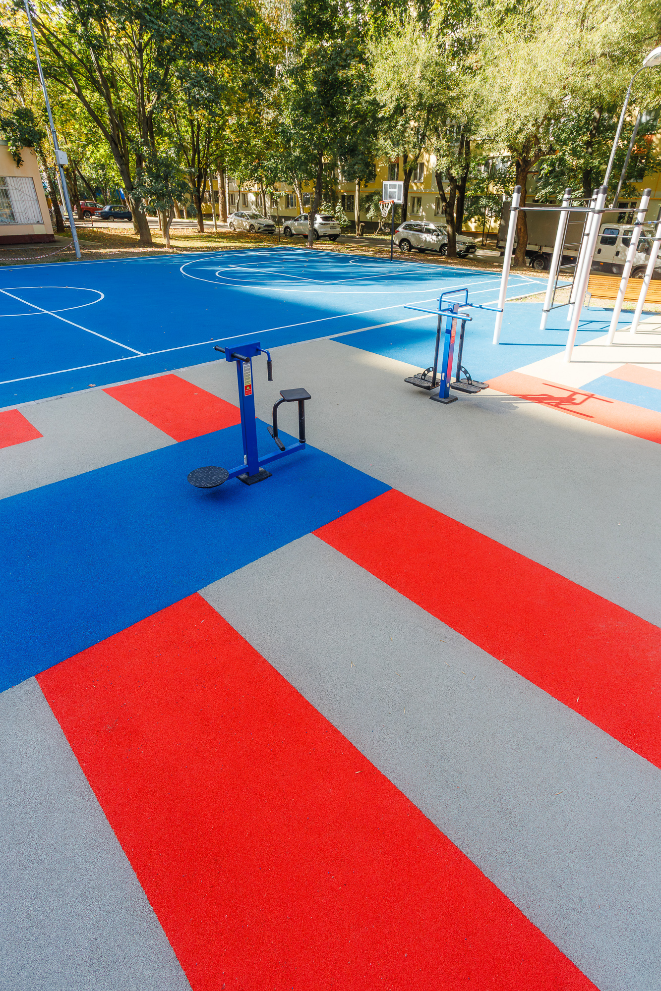Сфера применения красного гранулята:Укладка материала на рабочей поверхности начинается с подготовки основания. Если нагрузка на покрытие будет небольшая, то достаточно подушки из щебня. Насыпной материал равномерно распределяют, утрамбовывают, чтобы смесь из полимерного связующего и гранулята легла ровно. Важно не оставлять перепадов по высоте. После компоненты искусственного покрытия смешивают, наносят на рабочее основание слоем в 15-40 мм. Толщину покрытия определяют индивидуально, в зависимости от предполагаемых нагрузок и глубины засыпки амортизирующей подушки.